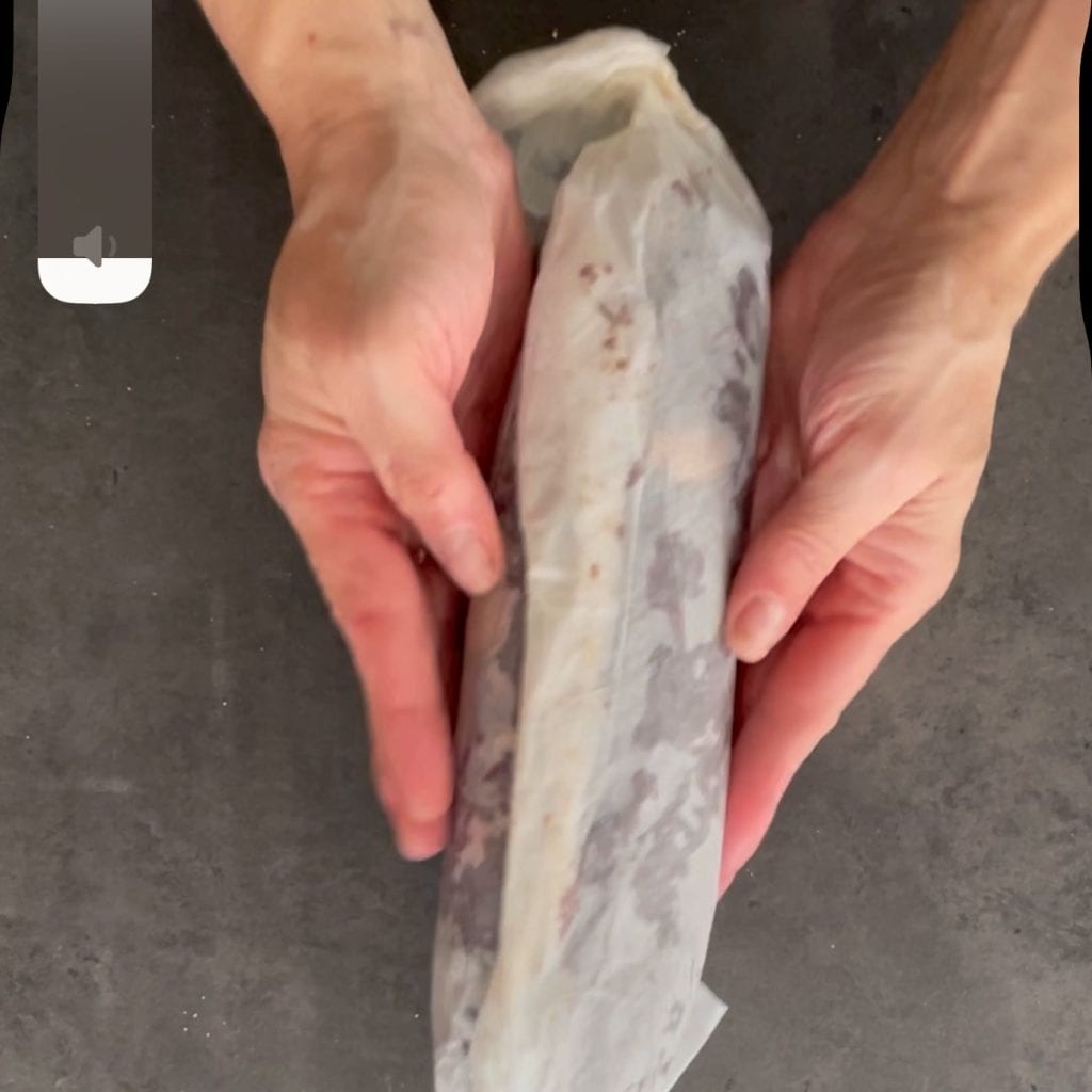 et en vous aidant du papier sulfurisé, compactez bien et donnez la forme d’un salami, placez-le au réfrigérateur.