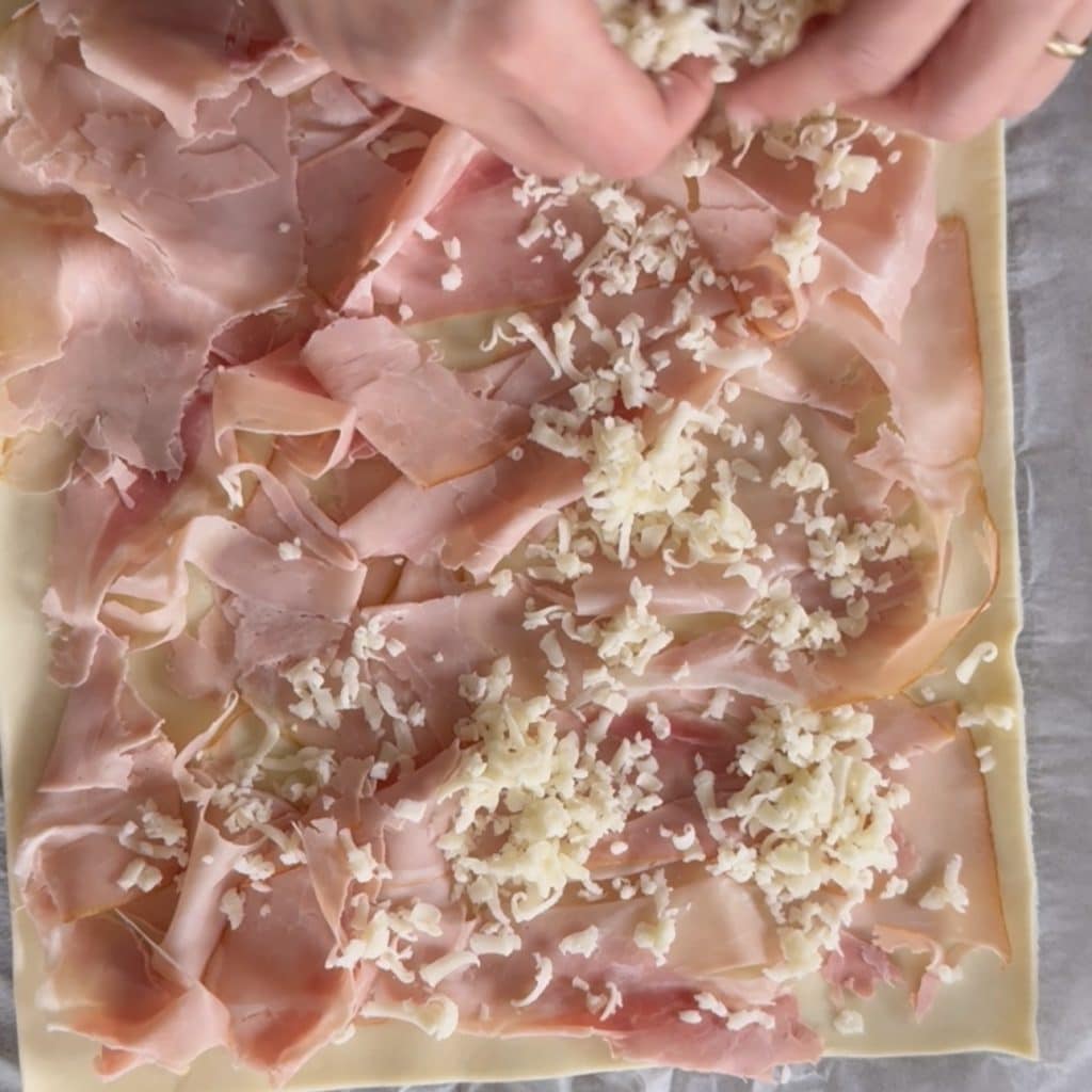 • déroulez la pâte feuilletée et ajoutez les tranches de jambon cuit