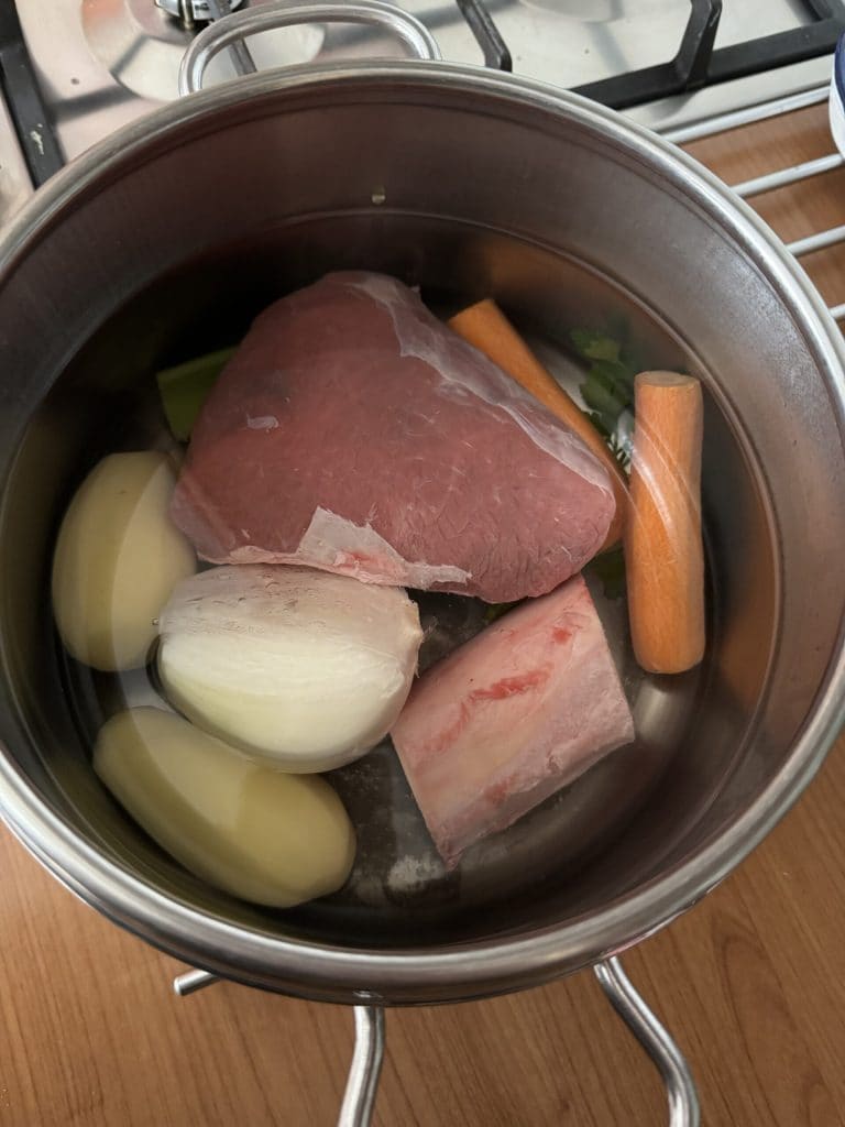 Après avoir nettoyé les légumes comme décrit précédemment, versez-les dans la cocotte-minute, ajoutez également la viande et l’os, versez l’eau et fermez le couvercle, mettez sur le feu à feu vif. Dès que vous entendez le sifflement, réduisez et laissez cuire pendant 60 minutes.