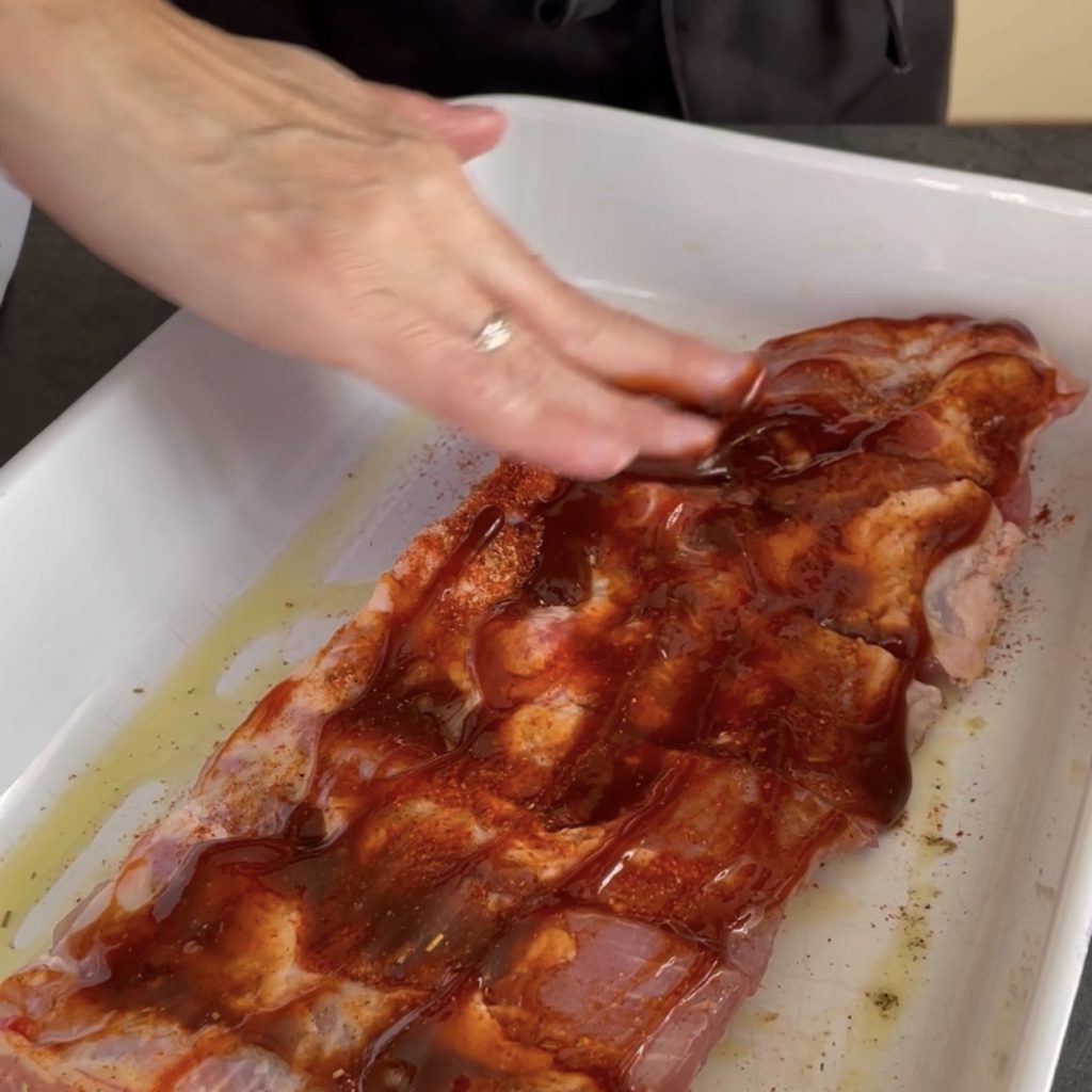 et massez-la sur les côtes des deux côtés pour que même la partie inférieure soit bien couverte de sauce.
