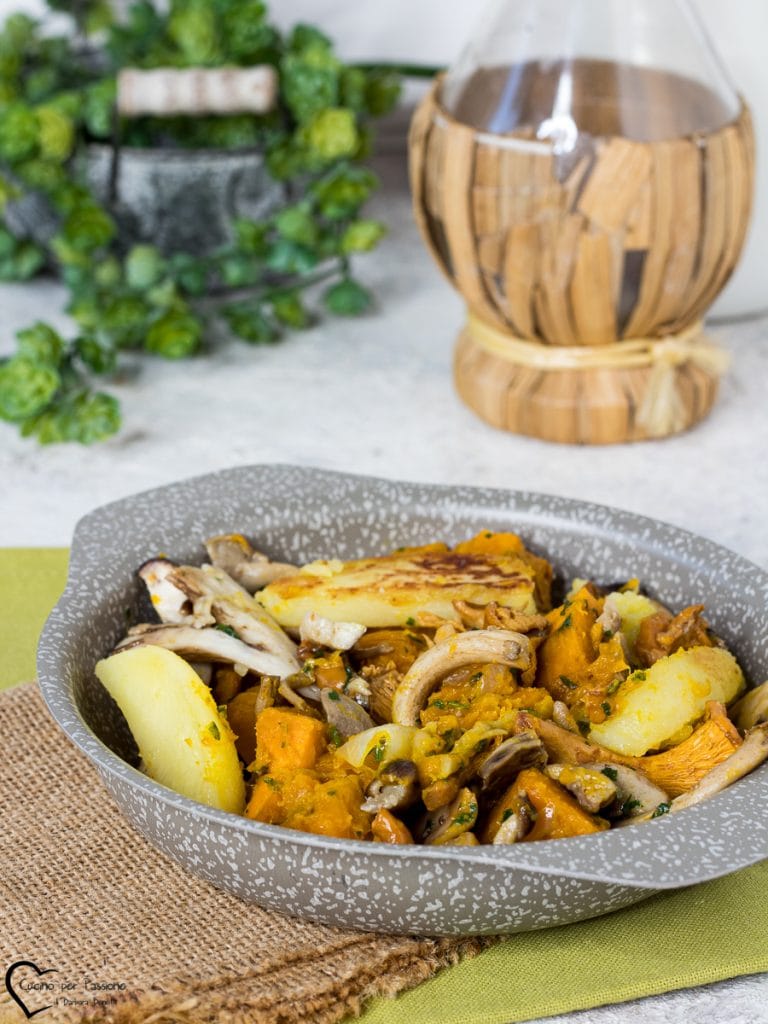 Courge, pommes de terre et champignons au four un accompagnement simple qui s’accorde parfaitement avec tout type de plat principal, j’ai aussi ajouté des pommes de terre pour avoir un plat encore plus complet. J’adore la courge et je l’essaie de plusieurs façons et en automne je prépare de nombreuses recettes en ajoutant également des champignons, vous pouvez mettre les champignons que vous préférez et que vous avez à disposition, même de simples champignons ou pioppini que l’on trouve toute l’année même au supermarché. Maintenant, voyons comment faire la courge et les champignons au four et si vous l’essayez, faites-le moi savoir. Barbara