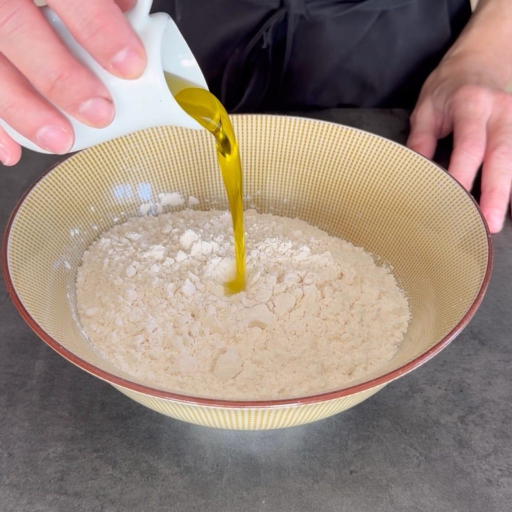 Commençons à préparer les Crackers croustillants saveur pizza, versez dans un bol la farine et l’huile d’olive extra vierge,