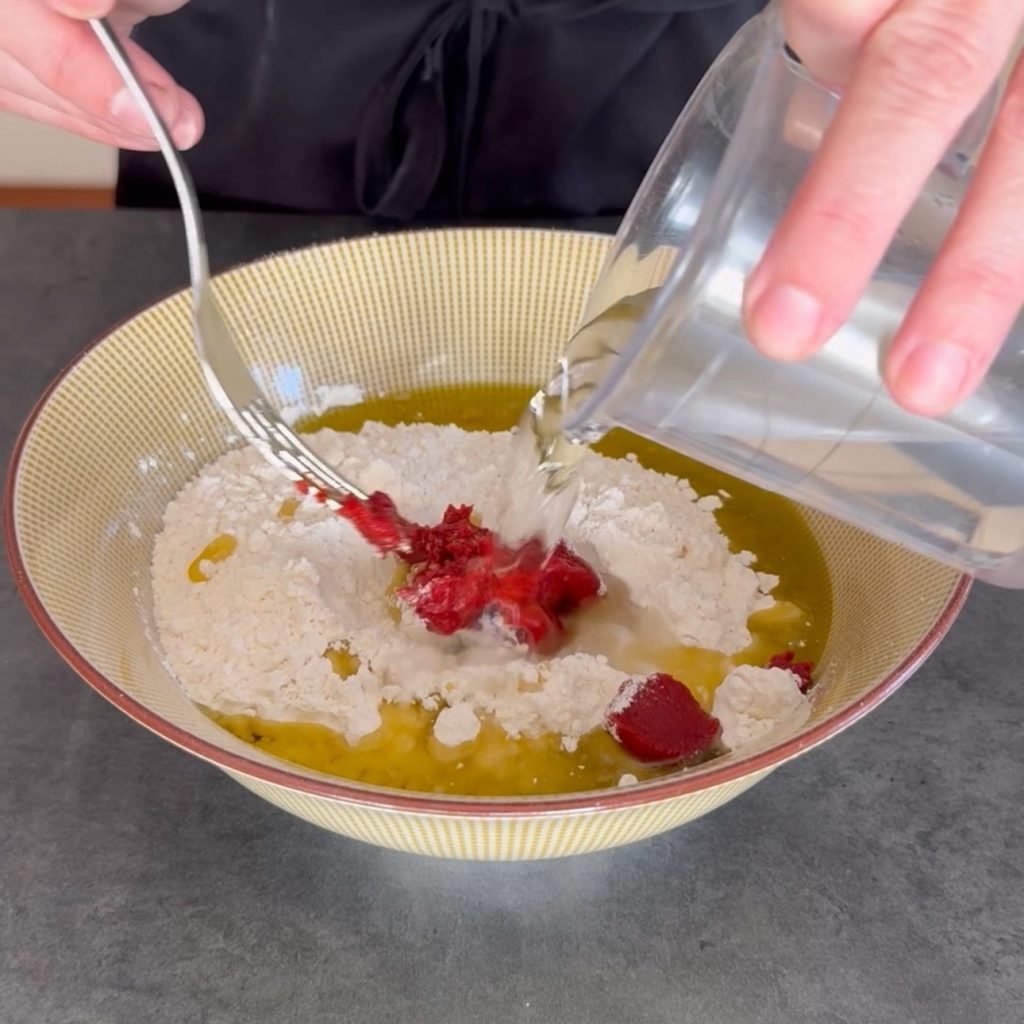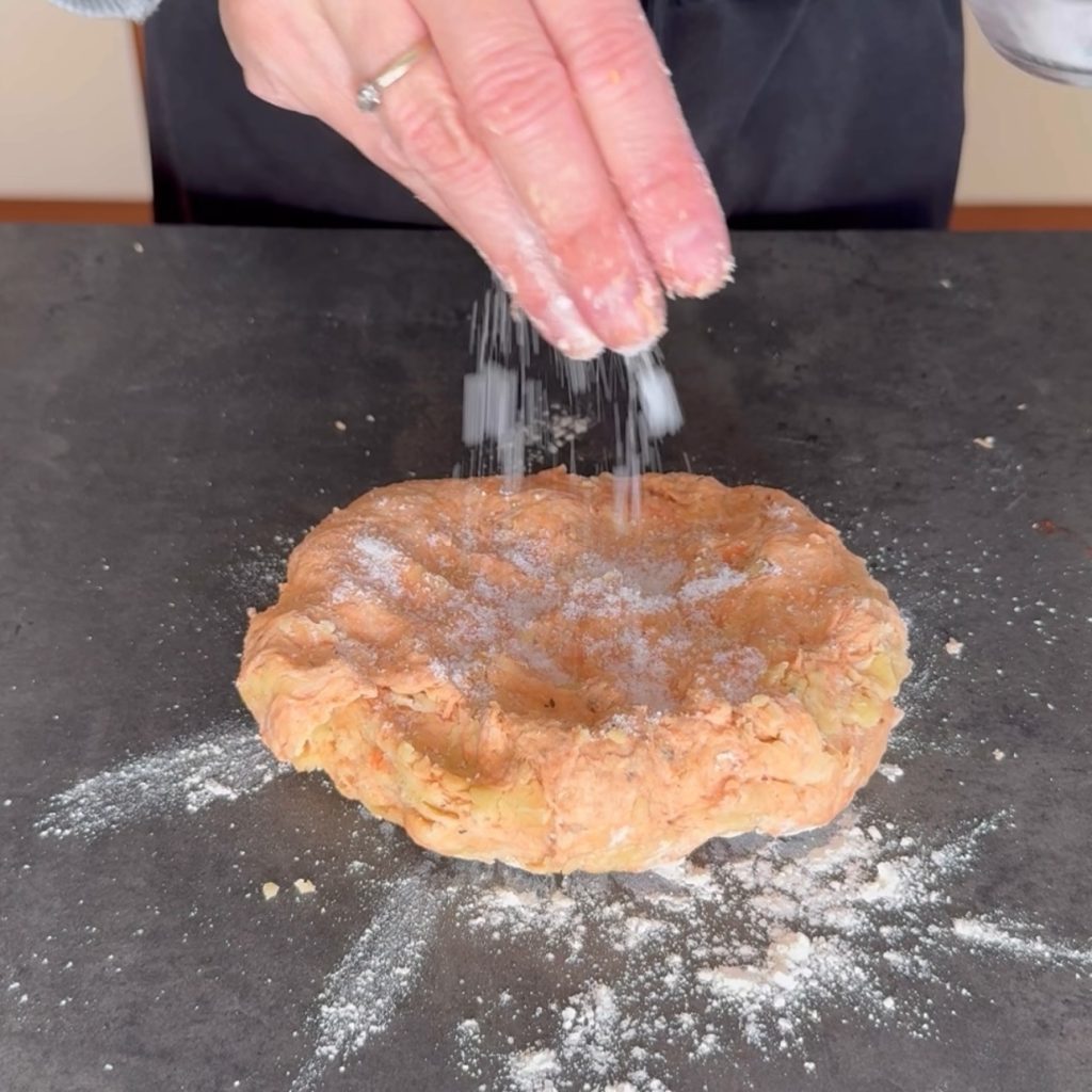 et ensuite pétrissez avec les mains jusqu’à obtenir une pâte compacte et homogène.