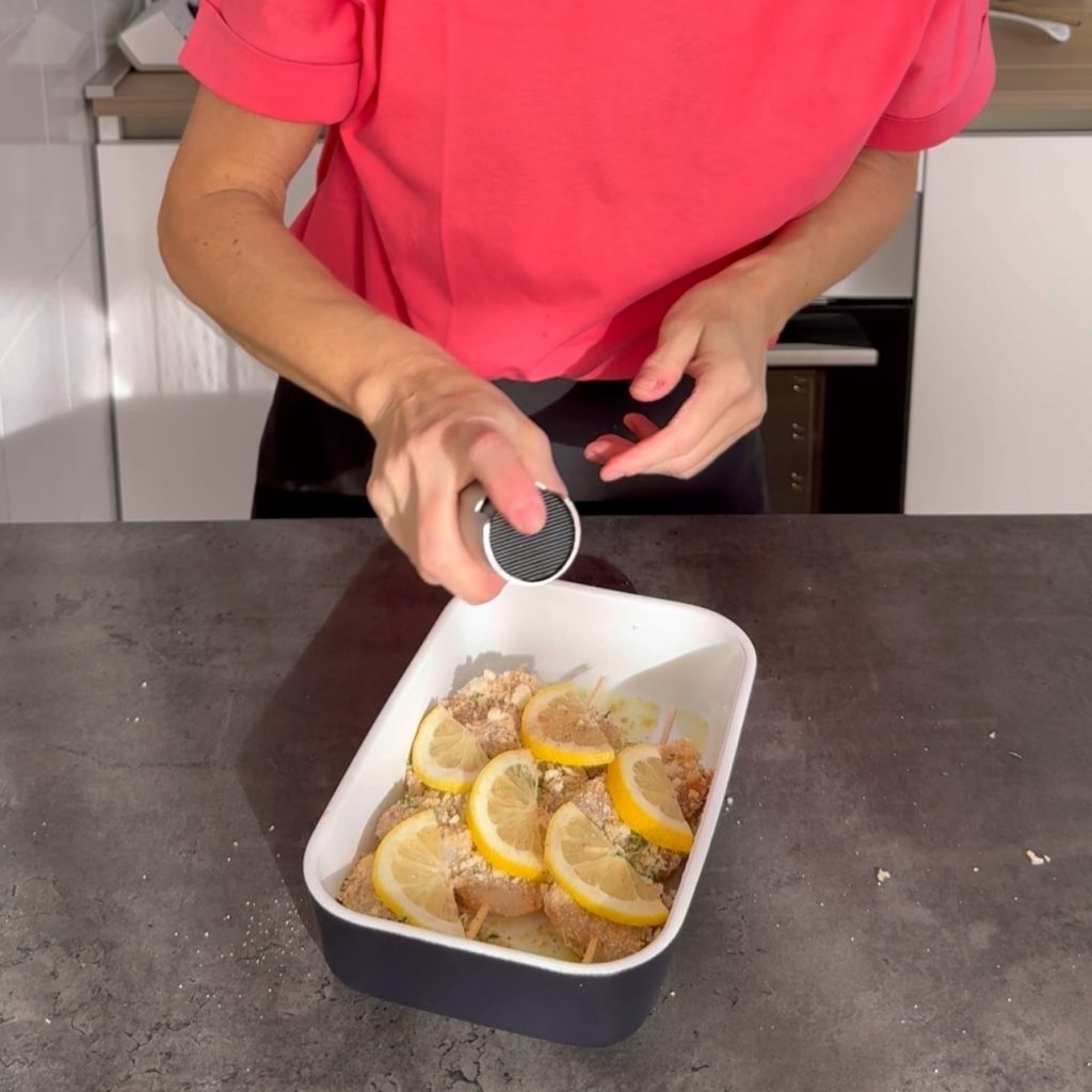 et disposez les brochettes dans le plat, ajoutez des tranches de citron,