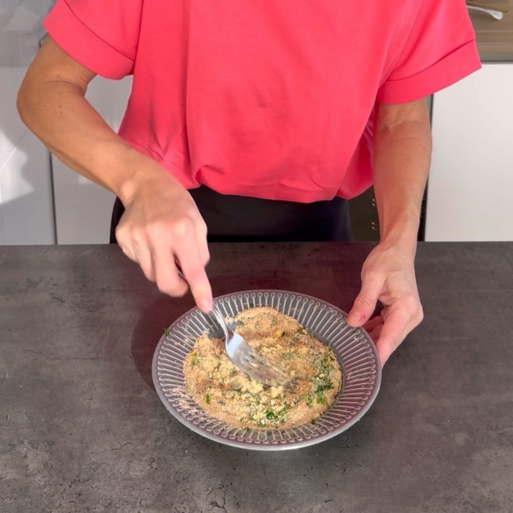 Commençons par préparer les crevettes au four, nettoyez les crevettes, enlevez la carapace, incisez le dos et à l’aide d’un cure-dent, retirez le fil noir et lavez-les sous l’eau courante. Versez dans une petite assiette la chapelure et hachez le persil,