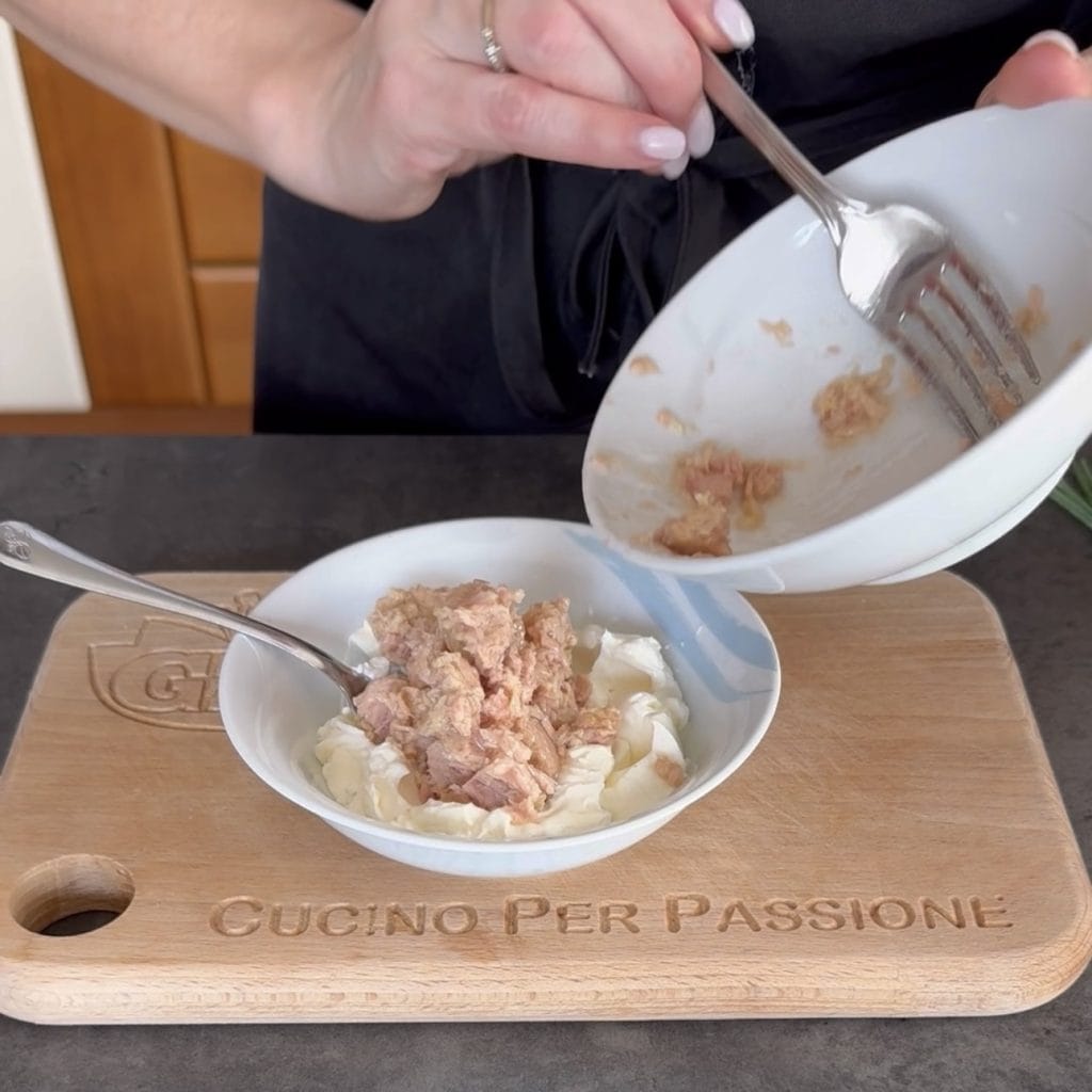 Commençons à préparer les Crostini avec philadelphia et thon, faites griller les tranches de pain et laissez-les refroidir, versez dans un bol le philadelphia, travaillez-le avec une cuillère pour le rendre crémeux,