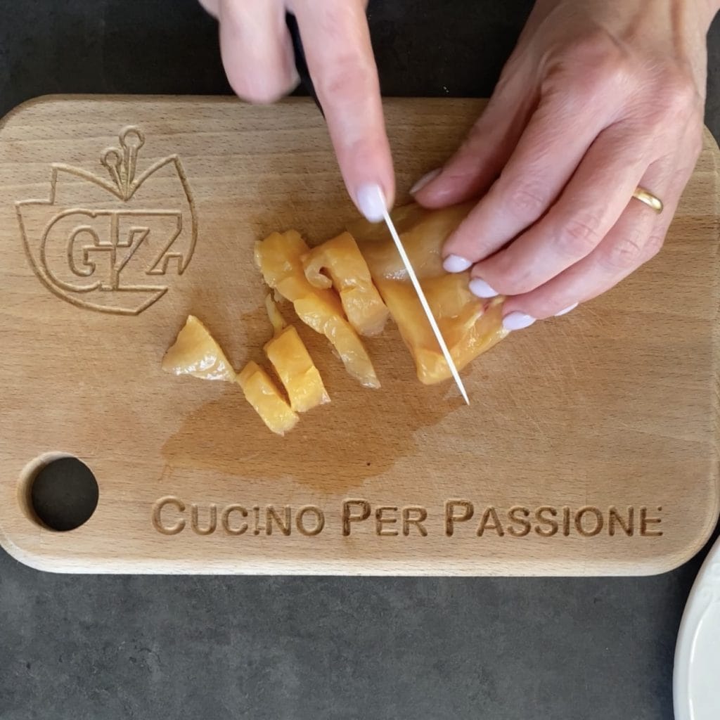 Commençons à préparer les émincés de poulet aux courgettes, coupez les courgettes en morceaux, en rondelles ou comme je l’ai fait, réalisez des spaghettis en utilisant l’outil approprié.