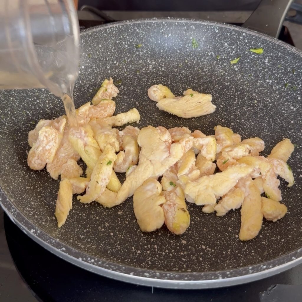 assaisonnez de sel, ajoutez un filet d’eau pour obtenir un blanc de poulet encore plus crémeux.