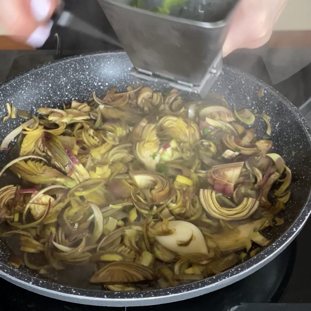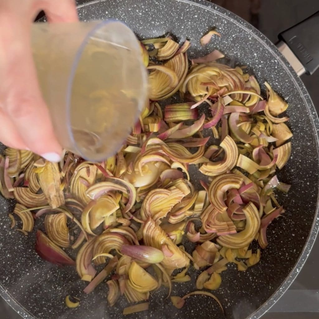 Lorsque le vin est évaporé, ajoutez les artichauts précédemment cuits,