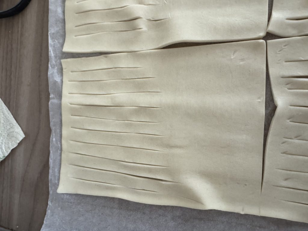 Commençons à préparer les feuilletés à la confiture : faites fondre le beurre au bain-marie ou au micro-ondes, déroulez la pâte feuilletée rectangulaire, coupez-la en 4 rectangles, sur la moitié de chaque rectangle pratiquez des incisions comme sur la photo.