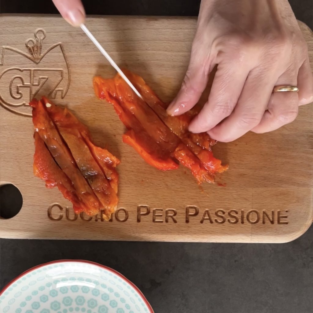 • Commencez à préparer les Filets de poivrons aux olives et câpres, rôtissez les poivrons et épluchez-les,