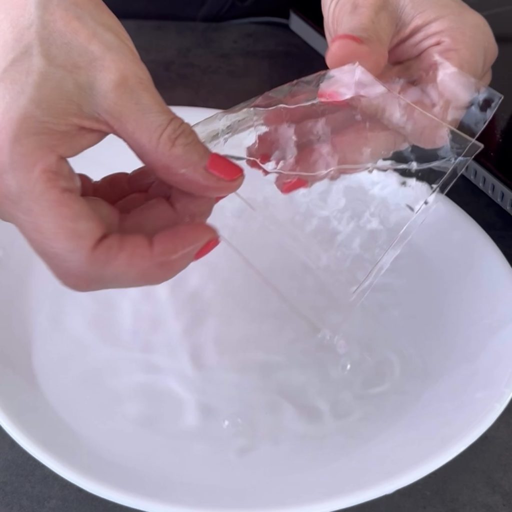 Commençons à préparer le Flan à la menthe, mettez à tremper dans l’eau froide les feuilles de gélatine
