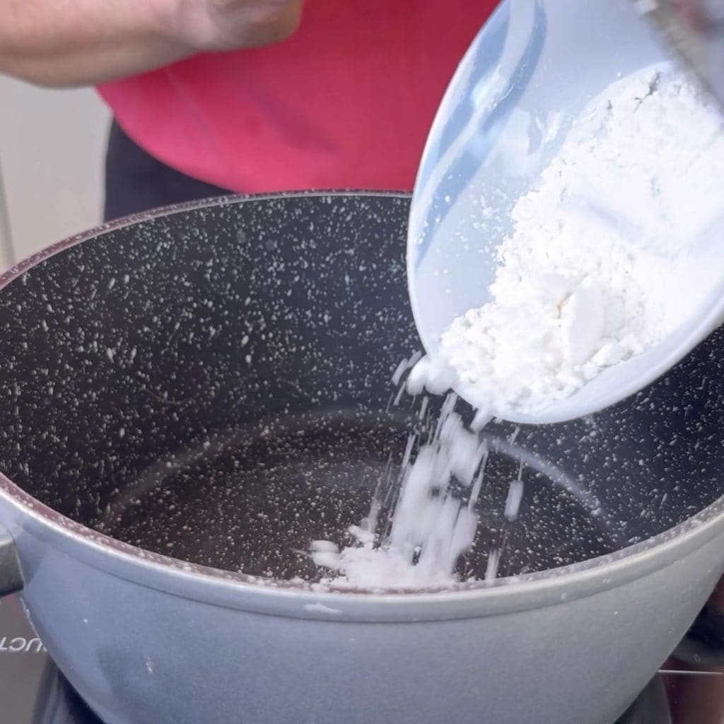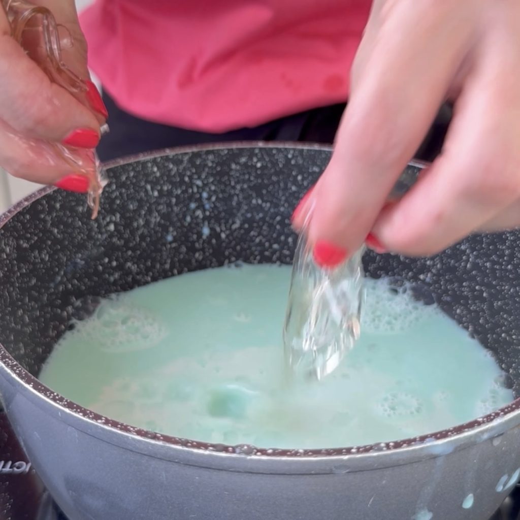 Lorsque le lait et la menthe sont chauds, prenez les feuilles de gélatine désormais ramollies et ajoutez-les, en mélangeant pour qu’elles fondent.