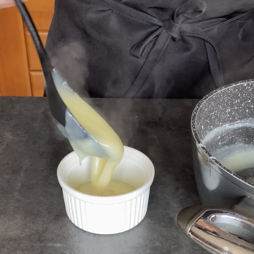 • Portez à ébullition et laissez épaissir, en remuant constamment avec le fouet pour éviter que ça ne colle au fond.
