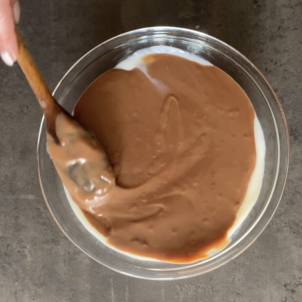 Reprenez le flan à la vanille qui entre-temps se sera épaissi et versez dessus le flan au chocolat,