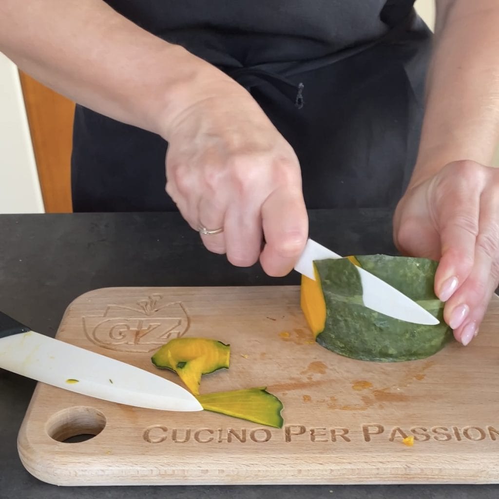 coupez le potiron, retirez les graines et les filaments internes, enlevez la peau