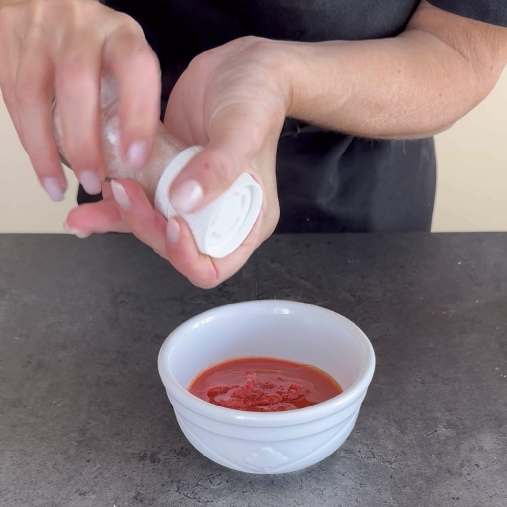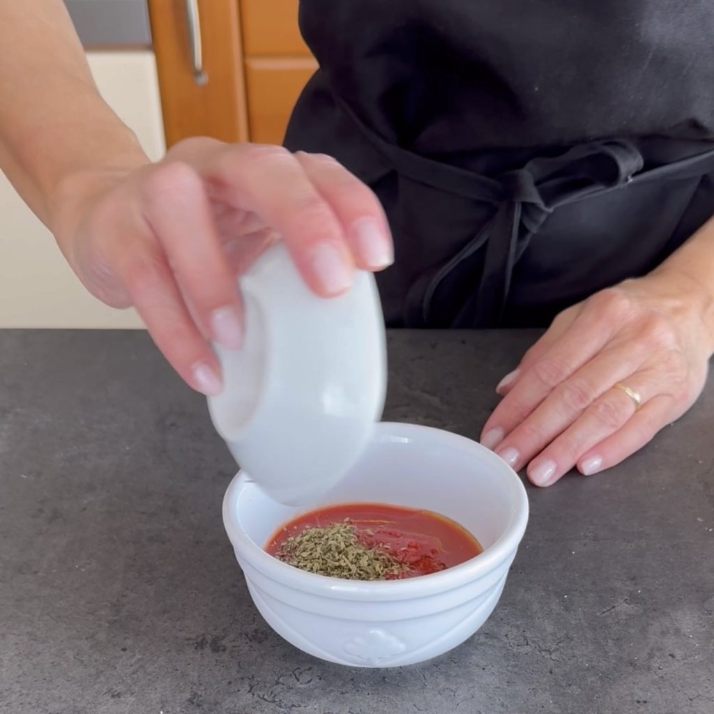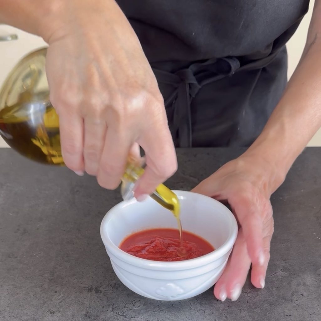 Versez dans un bol la purée de tomates et assaisonnez avec de l’huile d’olive extra vierge,