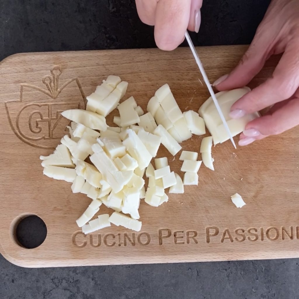 Entre-temps, coupez en morceaux la mozzarella pour pizza ou un autre fromage à pâte filée comme la scamorza ou la provola.