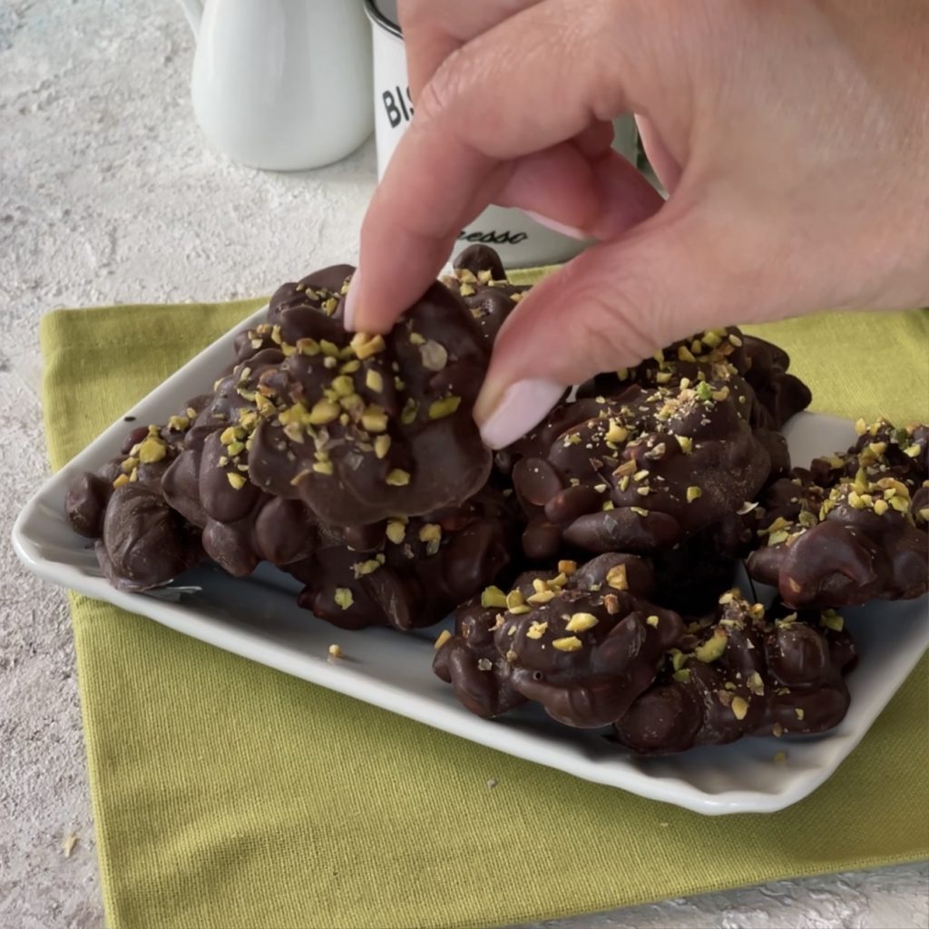 • Quand vous aurez réalisé tous les petits tas de fruits secs au chocolat, saupoudrez avec les éclats de pistache.