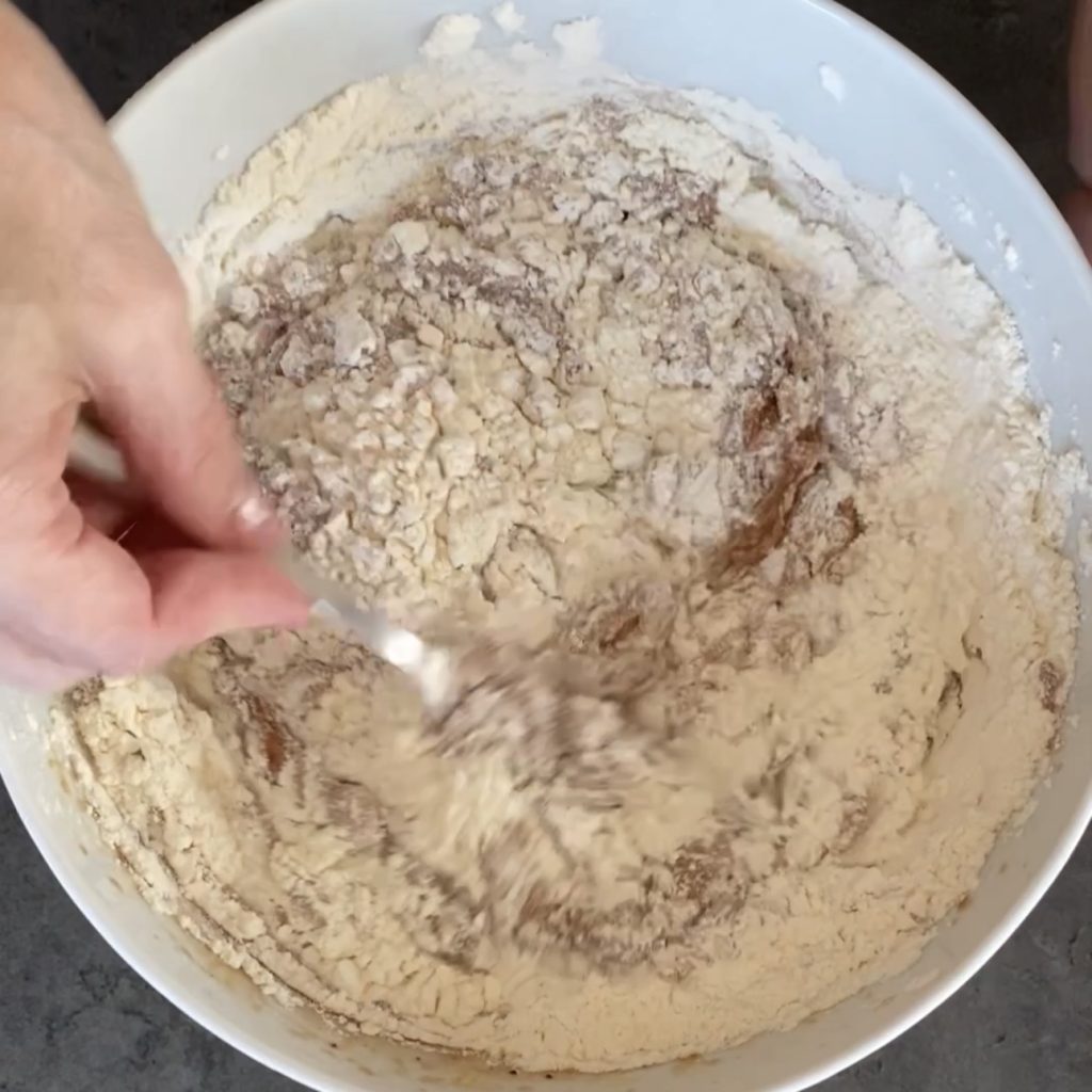 intégrez la farine aux autres ingrédients avec une fourchette ou si vous préférez, vous pouvez le faire aussi avec les fouets électriques.