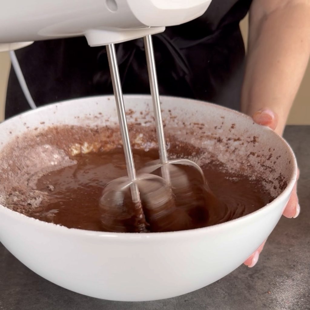 et incorporez le tout toujours avec les fouets jusqu’à obtenir un mélange crémeux et sans grumeaux.