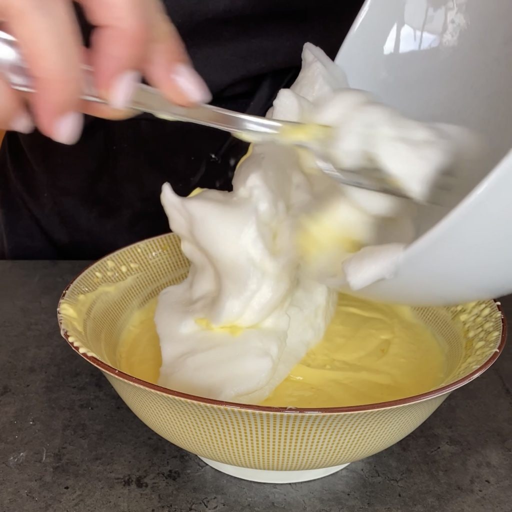 et ajoutez les blancs d’œufs précédemment montés en neige,
