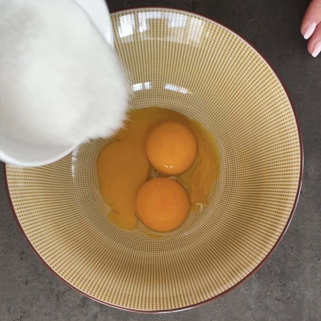Nous commençons à préparer le Gâteau au yaourt grec, séparez les œufs, versez les blancs d’œufs dans un bol et les jaunes dans un autre. Montez les blancs en neige bien ferme.