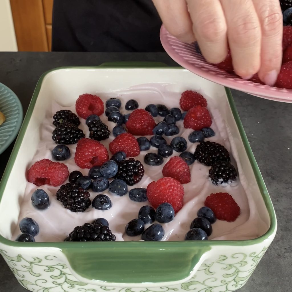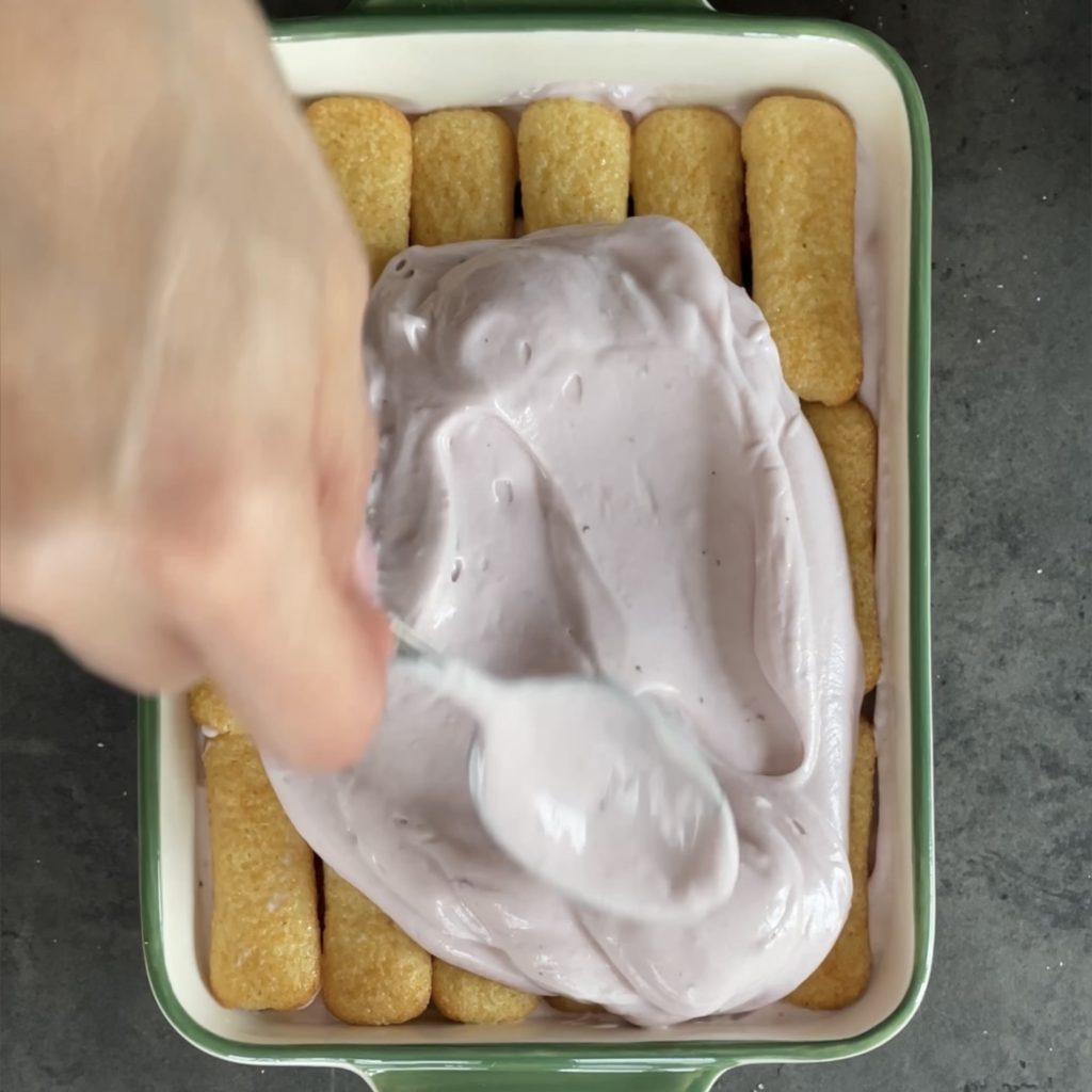 Couvrez le plat avec du film alimentaire et laissez reposer le gâteau aux fruits des bois et mascarpone au réfrigérateur pendant 6 heures avant de le servir.