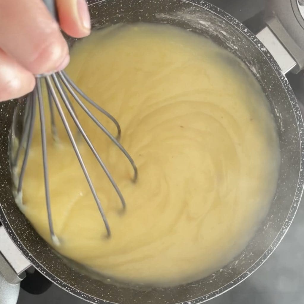 Mettez sur le feu et en mélangeant constamment, portez à ébullition vous verrez que la crème épaissit, faites cuire quelques minutes.