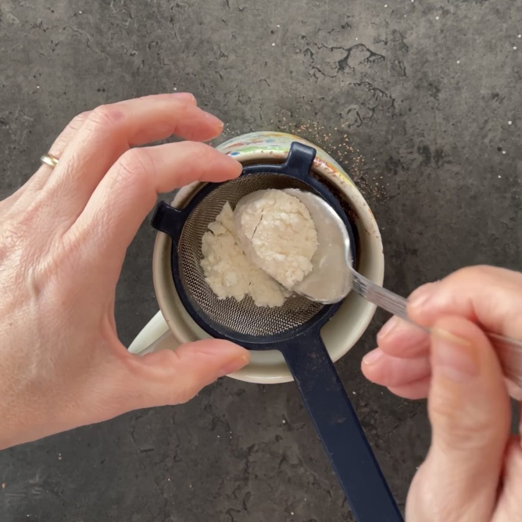Il vaudrait mieux tamiser les ingrédients secs ; je place un petit tamis sur la tasse et je les ajoute directement, ajoutez le cacao amer,
