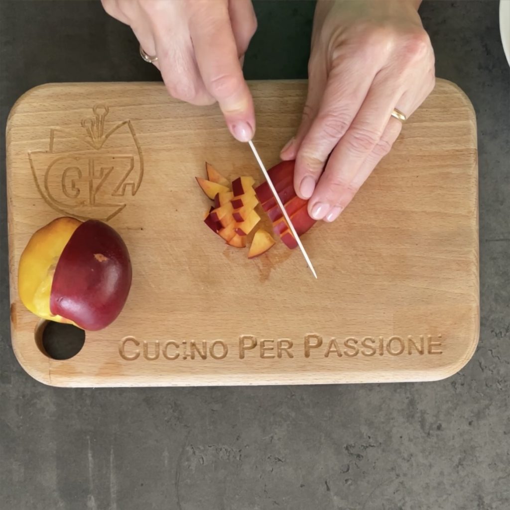 Commençons à préparer le Gâteau Frais aux Pavesini et Pêches, lavez le brugnon ou la nectarine, enlevez le noyau et coupez la chair en petits morceaux.