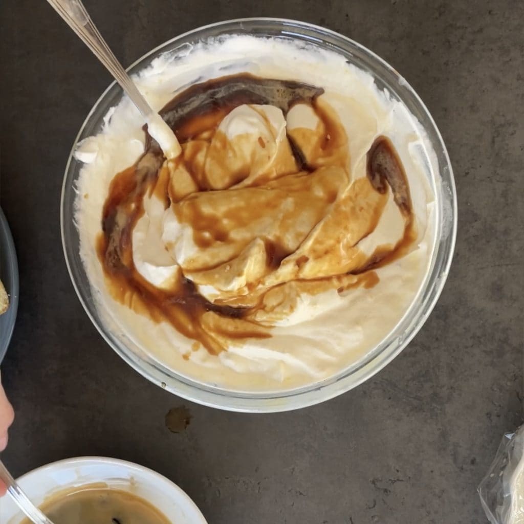Couvrez immédiatement la crème avec du film plastique pour qu’elle ne forme pas de croûte, laissez-la refroidir. Puis placez-la au réfrigérateur. Préparez le café et conservez-le également au réfrigérateur.