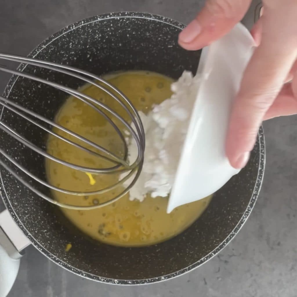 Ajoutez ensuite la fécule de maïs, travaillez le tout toujours avec le fouet