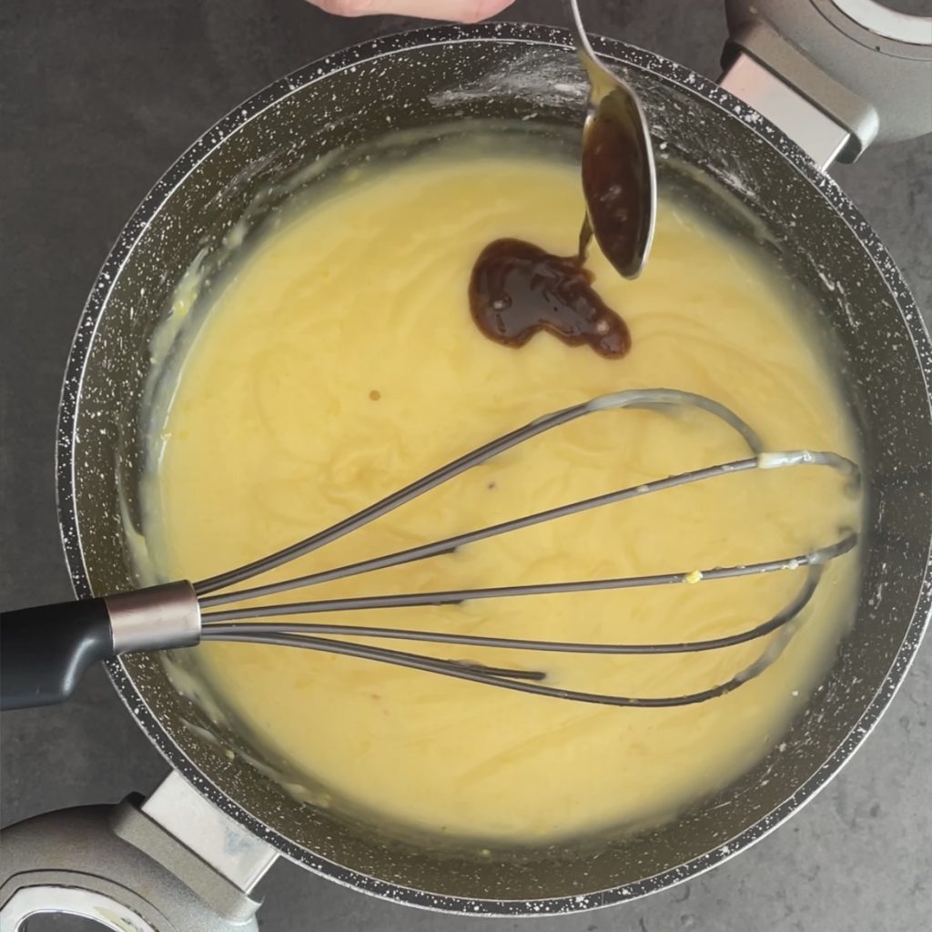 Retirez la crème pâtissière du feu, ajoutez une cuillère à café d’essence de vanille