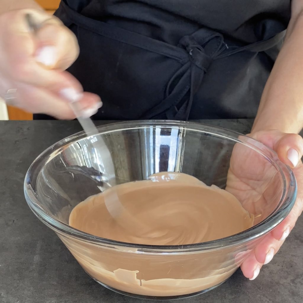 • Quand il sera fondu, mélangez pour obtenir un chocolat homogène, laissez-le de côté pour qu’il refroidisse.