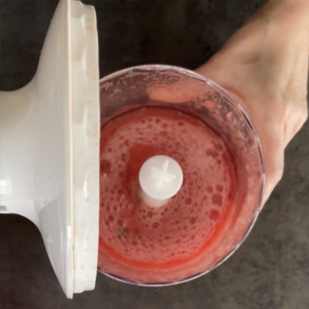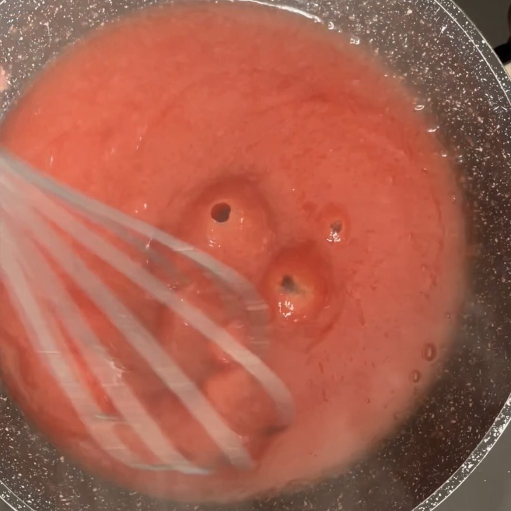 et incorporez progressivement le jus de pastèque, vous devez obtenir un mélange sans grumeaux.