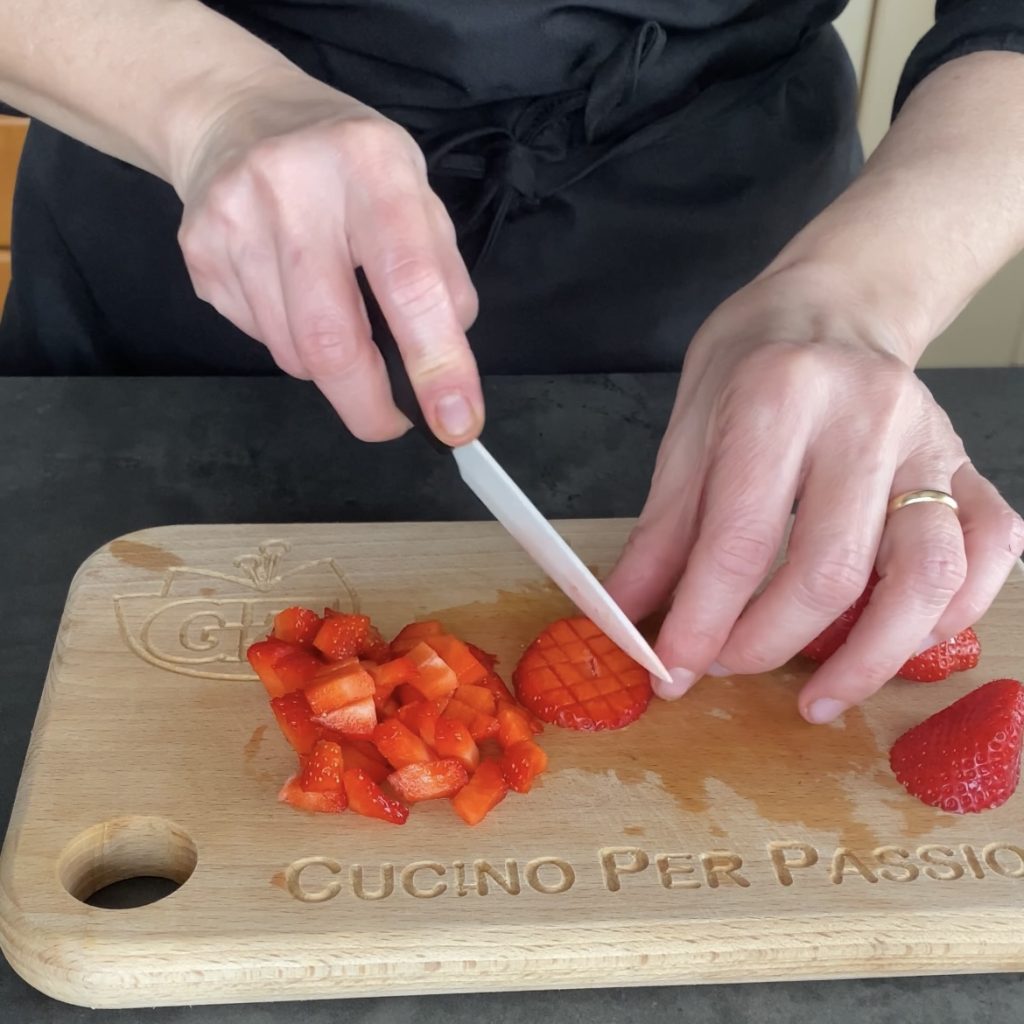 Lavez les fraises, retirez la partie avec les feuilles et coupez-les en petits morceaux,
