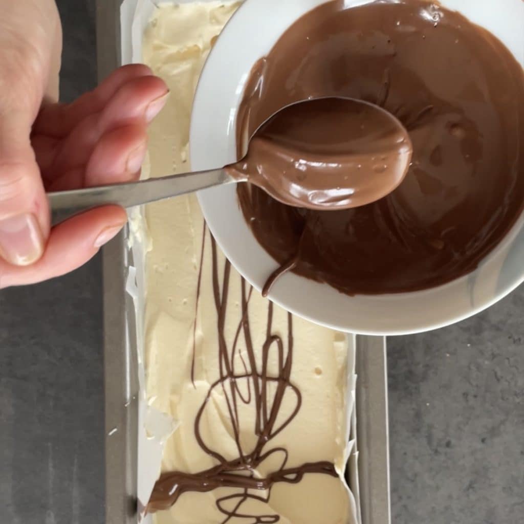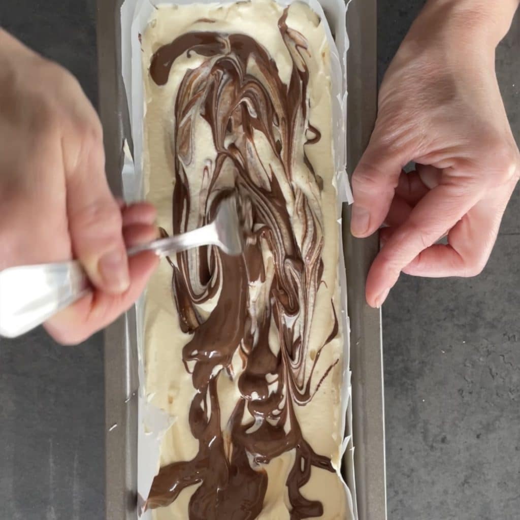 Faites ramollir la Nutella quelques secondes au micro-ondes ou au bain-marie et versez-la sur la crème avec une cuillère,