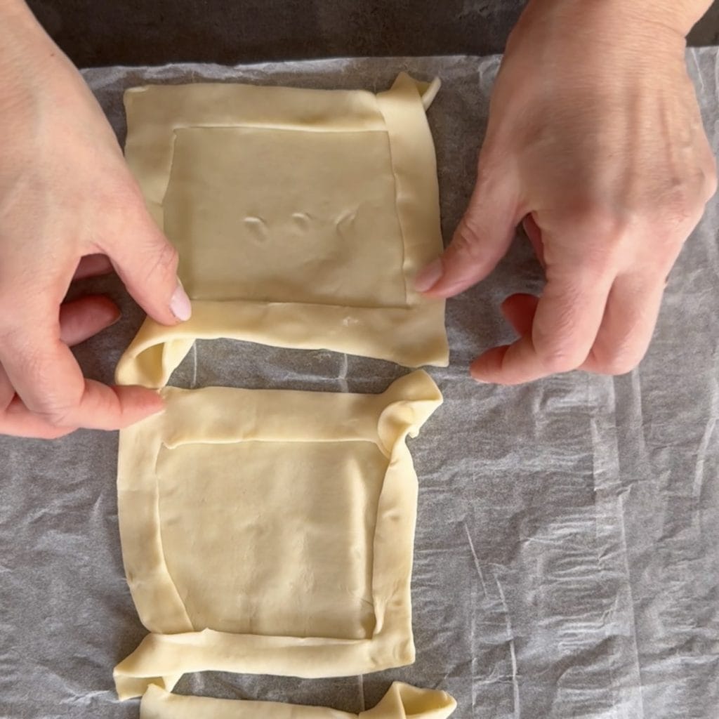 Commençons à préparer les mini-quiches de pâte feuilletée au jambon et mozzarella, gardez devant vous le côté le plus long de la pâte feuilletée et coupez de manière à avoir 6 rectangles, faites des découpes en L sur chaque rectangle comme vous le voyez sur la photo, en laissant deux coins intacts sur environ 2 cm de chaque côté.