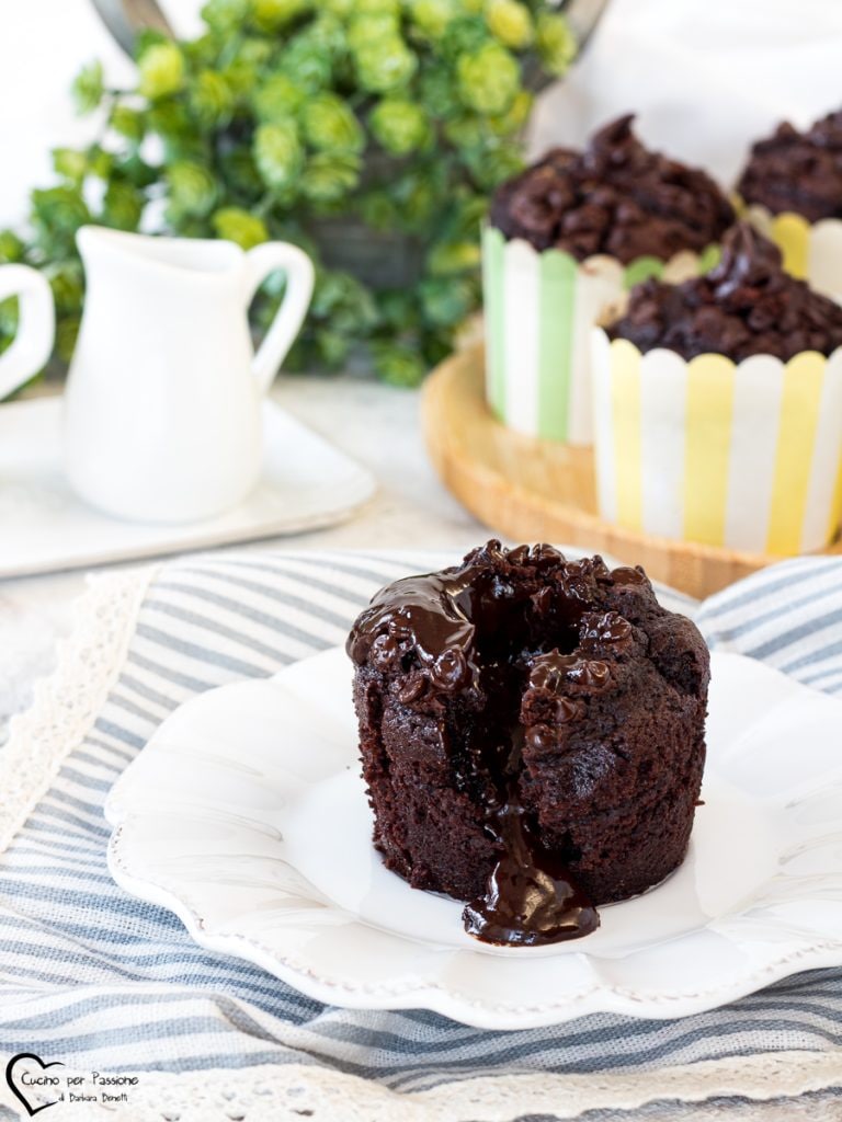 Avec un couteau ou un vide-pomme, faites un trou au milieu des muffins et remplissez le vide avec la ganache au chocolat, laissez le chocolat prendre ou si vous préférez les déguster avec le chocolat mou, réchauffez-les quelques secondes au micro-ondes.