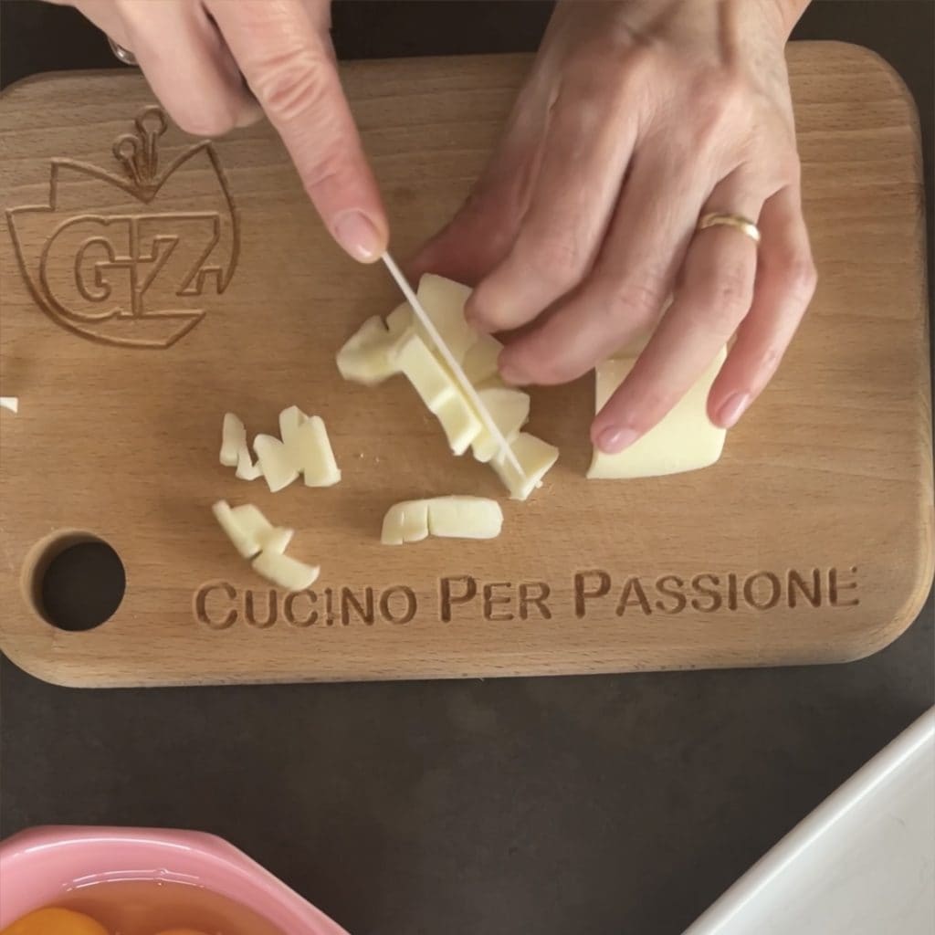 Coupez en petits morceaux la mozzarella pour pizza ou un fromage à pâte filée comme la scamorza ou la provola.