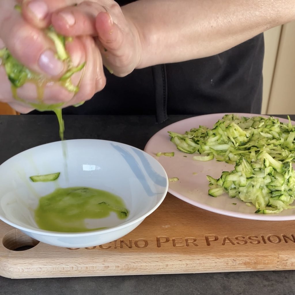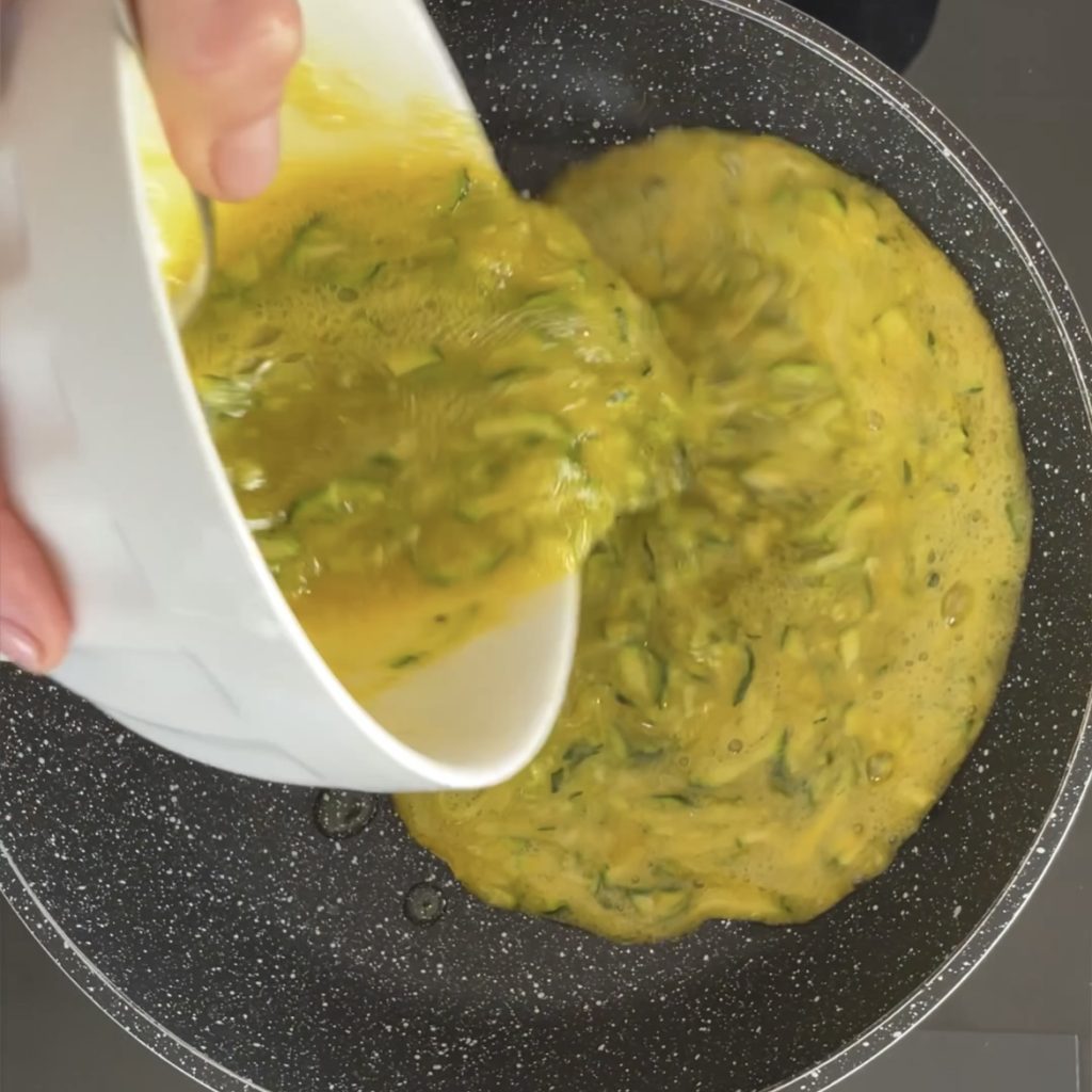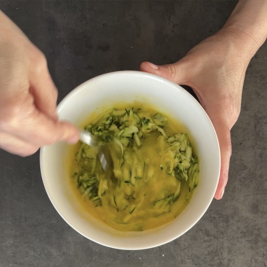 Commençons à préparer l’Omelette de courgettes farcie au thon, lavez la courgette, coupez les extrémités et râpez-la avec une râpe à gros trous et
