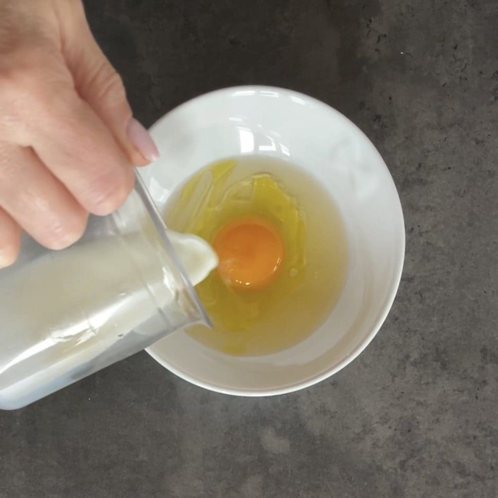 Commençons par préparer le Pain de mie garni, versez dans un bol l’œuf et ajoutez une cuillère d’huile d’olive extra vierge,