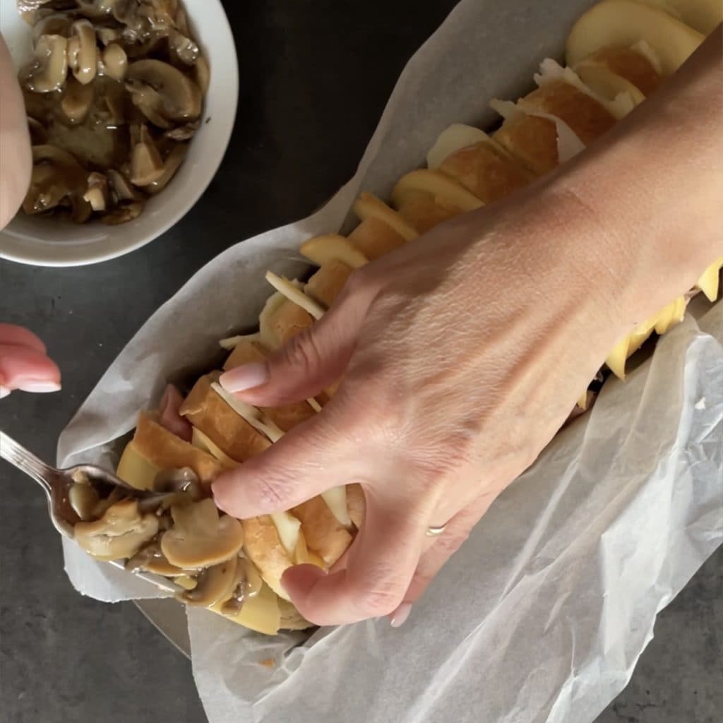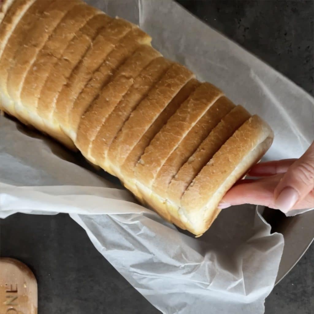 Quand le Pain de mie garni sera prêt, sortez-le du four et servez-le chaud en détachant les tranches nécessaires pour la portion désirée.