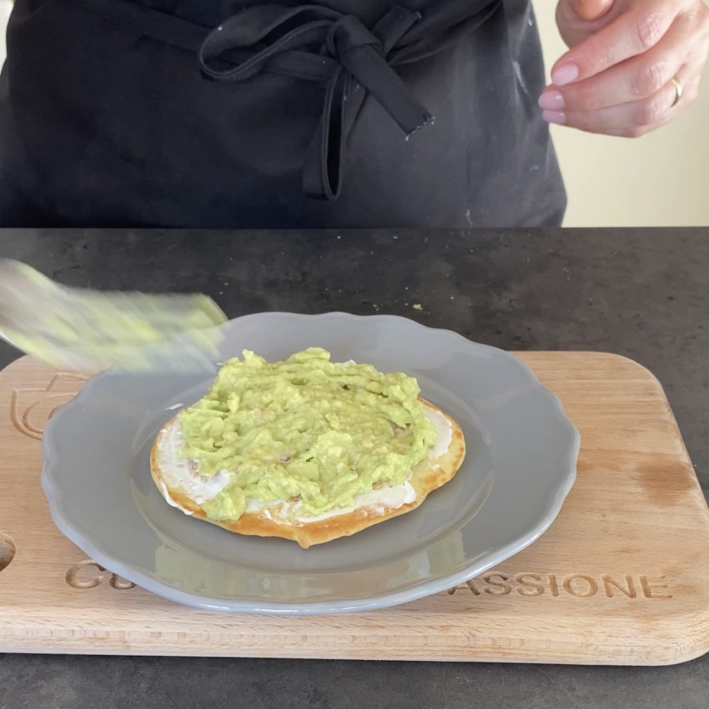 • Ajoutez une pincée de sel et de l’huile d’olive extra vierge et travaillez le tout avec une fourchette pour la rendre belle lisse et crémeuse.