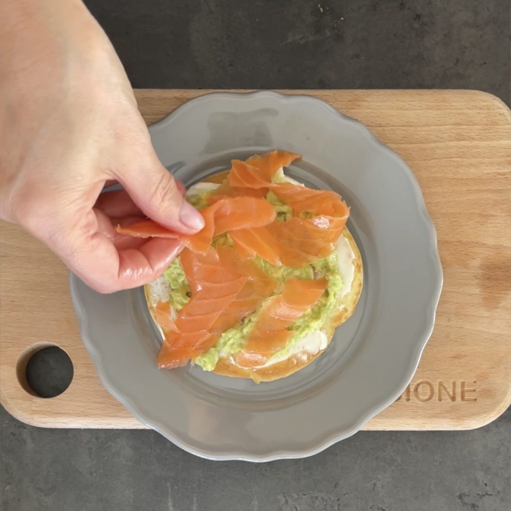 • garnissez toujours avec du fromage à tartiner, de la crème d’avocat, du saumon fumé, de la ciboulette et cette fois ajoutez aussi quelques feuilles de roquette.