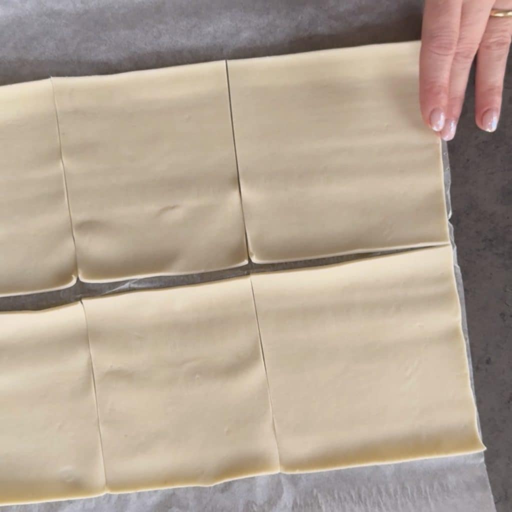 Étalez la pâte feuilletée rectangulaire, coupez le côté le plus court en deux et le plus long en 3 parties pour obtenir 6 rectangles.