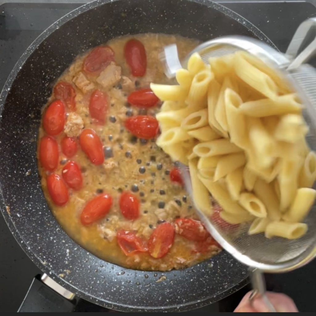 Lorsque les pâtes sont cuites, égouttez-les et ajoutez-les à la sauce aux tomates et au thon.