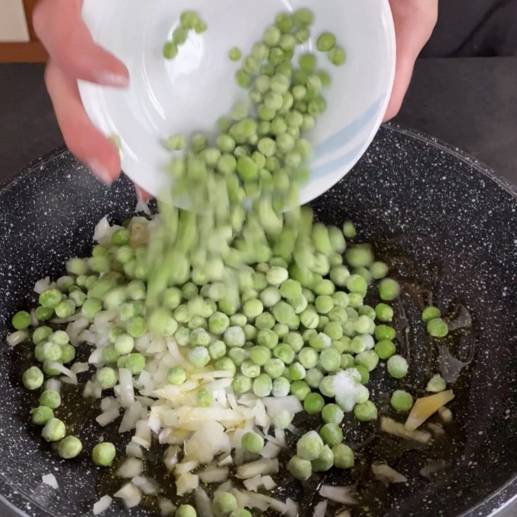 et ajoutez également les petits pois surgelés ou frais comme vous préférez.