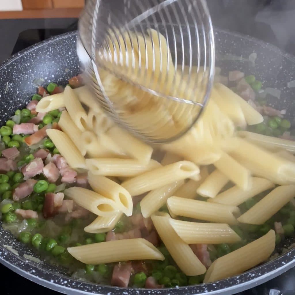 Pâtes petits pois et lardons un premier plat très savoureux et délicieux, les lardons fumés donnent aux pâtes une saveur unique et parfumée, et la douceur des petits pois s’accorde parfaitement. Les lardons fumés ajoutent cette saveur forte et particulière qui caractérise ce plat et le rend spécial. Les pâtes lardons et petits pois se préparent rapidement et vous pouvez utiliser soit des petits pois congelés soit des petits pois frais selon la saison. J’adore les pâtes avec des petits pois au point que je les fais de nombreuses façons, de la plus simple Pâtes avec des petits pois, ou encore PÂTES PETITS POIS ET CHAMPIGNONS, PÂTES 3 P PETITS POIS JAMBON ET CRÈME, Pâtes avec petits pois et mortadelle, ou encore PÂTES AVEC JAMBON CUIT ET PETITS POIS. Voyons maintenant comment faire les pâtes petits pois et lardons et si vous l’essayez, faites-le moi savoir. Barbara
